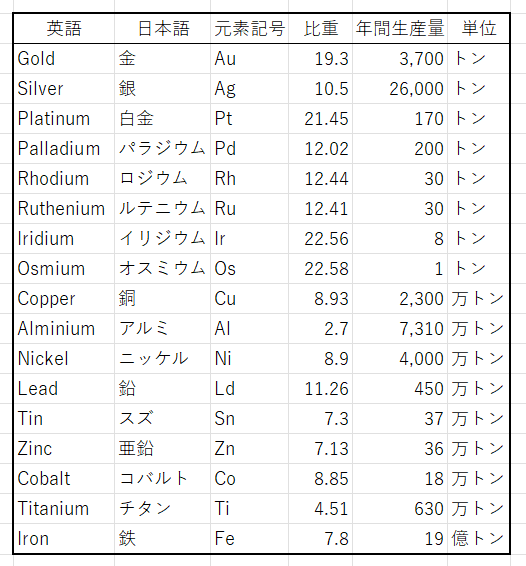 貴金属 卑金属の年間生産量🧐