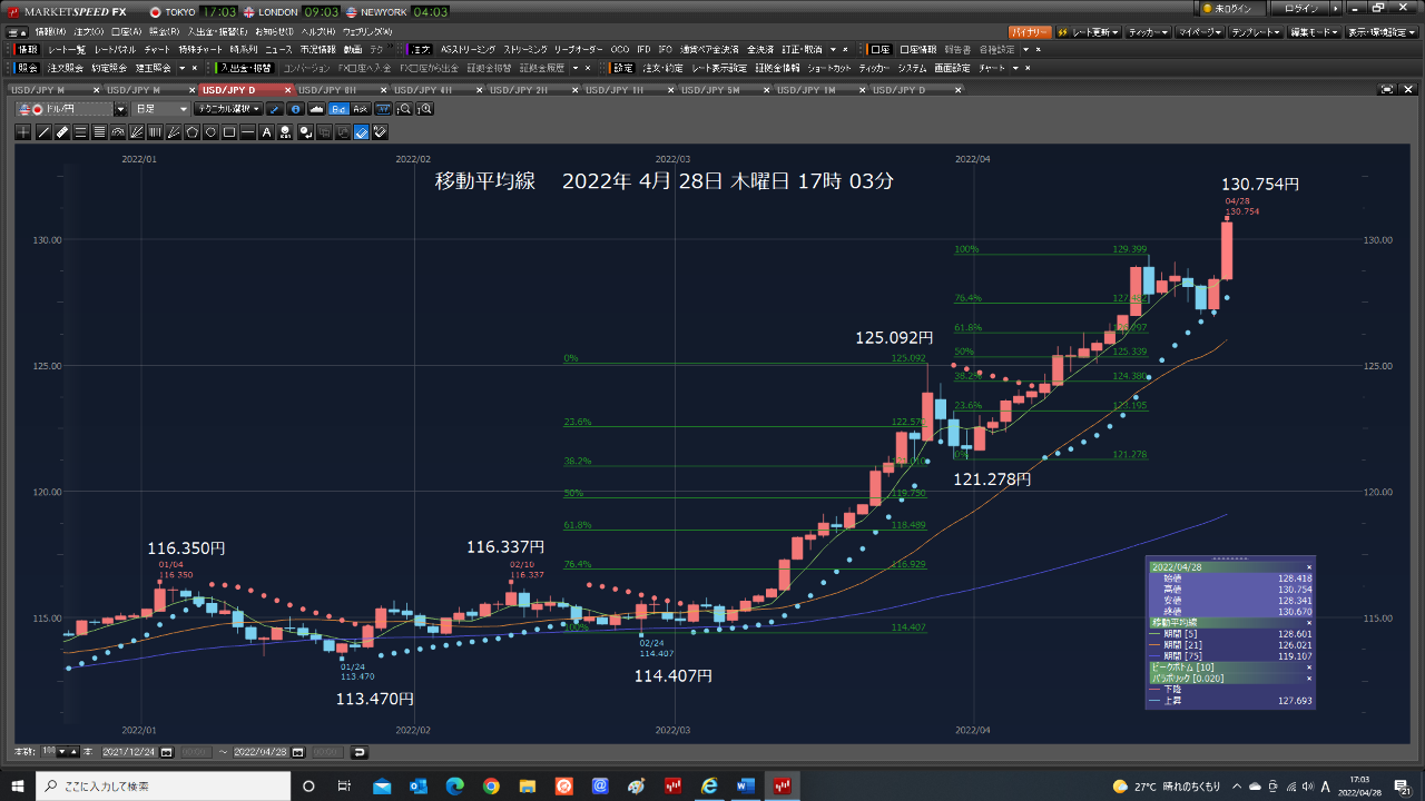 12万ドル指値130.030円で、利確できていた。2022/04/28 木曜日14:38:39 約定