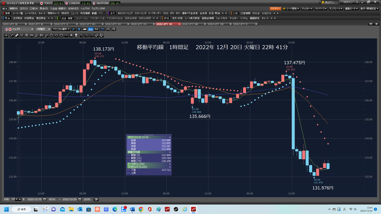 1万ドル 132.563円で、成り行きショート、2022/12/20 22:37:57