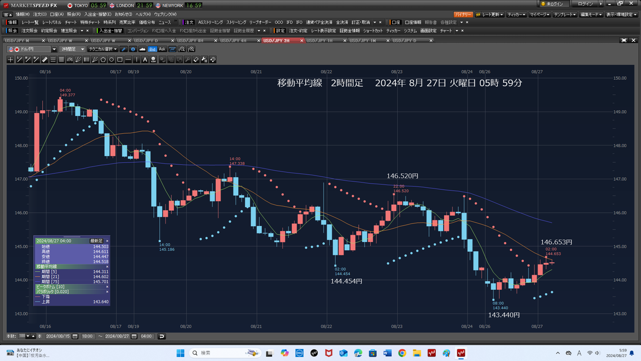 2024/08/22木曜日の1時間足、パラボを参考にして、