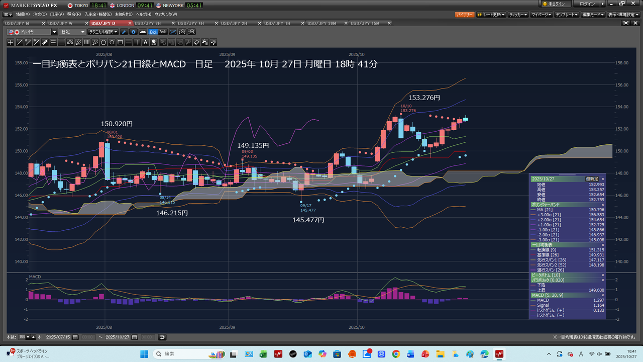 2025年10月27日 月曜日 ドル円 日足陰線だ。