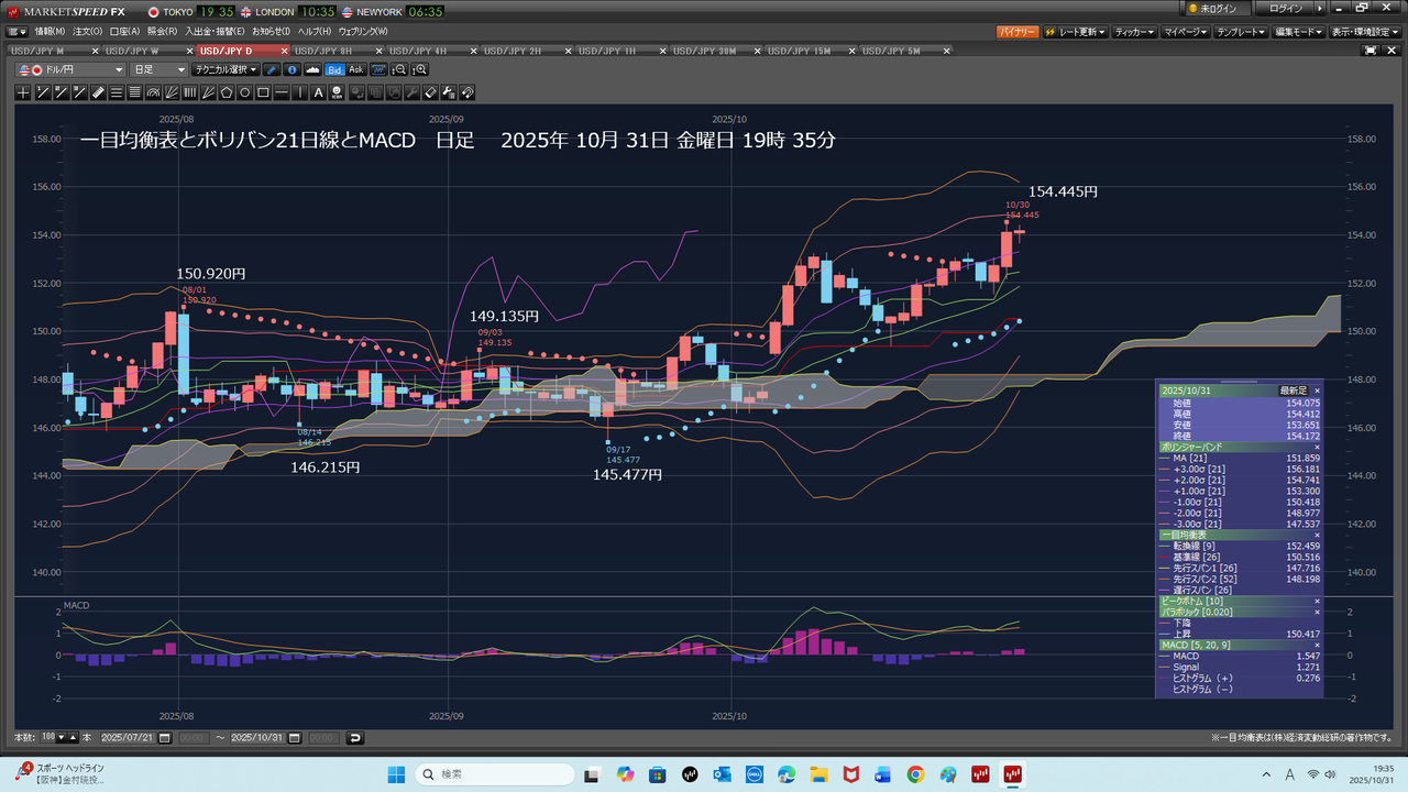 2025年10月31日 金曜日 FOMC後と日銀会合後だ。どうかしていた。今週は、負けてしまった。もう自分が、わからなくなってしまっていた。火曜日家に帰ると、直ぐに投げたのだった。総計3845円も負けた。勝っていたのに利確が遅れた。月曜日が、利確だった。まさか、下げるとは、思いもしなかった。利確は常に勝者だった。絵にかいた餅は、食えないのだった。日足パラボが陽転していた。それに日足ボリバン、バンドウオークだった。もうドル円上がると妄信していた。ボリバンバンドウオークの上は開いているが、下は平行に近いだろう。これから 上に行かずに一旦ダブルトップの可能性も考えるべきだった。だからデモでも、逆指値3万ドルと指値3万ドルのロング注文を、出していた。逆指値は、SLで撃たれて、デモで、これで直ぐに8520円負けた。今デモ8万円ぐらい勝っていたのに、今勝ちは、1万7851円に大きく減少だ。まだFXするのは早すぎる。来年の11月から、2026年11月から開始だ。根性で、1年間は、FXしないぞ。それとやはりドル円一直線なら日経一直線だ。個別は、その時に考えよう。12月日銀の利上げから、逆回転では、ないのか。それまで、株は、封印だ。その時に1321買い下がりでは、ないのか。余裕資金があるときは、三菱重工の買い注文も考えよう。何しろ、FX2026年11月から開始だ。この日から1年後に開始だ。根性だろう。