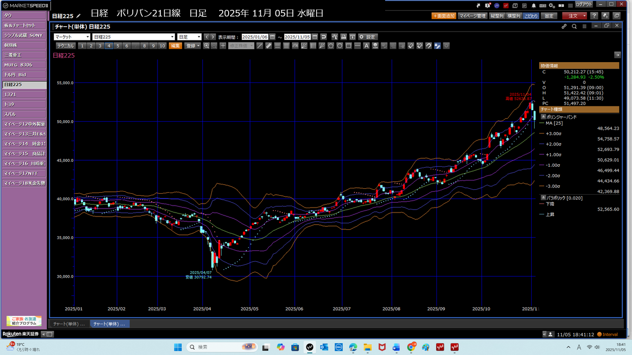 5日の東京株式市場で日経平均株価は大幅に続落し、終値は前日比1284.93円(2.50%)安の5万0212.27円だった。人工知能(AI)関連銘柄の割高感が意識され、前日の米市場でハイテク株に売りが広がった。東京市場でも朝方からハイテクや半導体関連株に売りが先行した。日経平均の下げ幅は一時2400円を超え、心理的な節目の5万円を下回った。