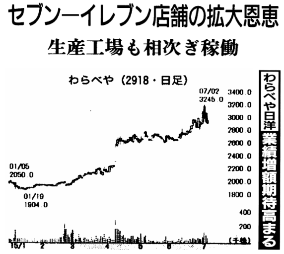 株階段.![わらべや日洋ホールディングス(株)【2918】 【 10年前(2015年) 】 わらべや日洋 [2918] (2015年) 中食業界で首位。セブン‐イレブン向けが収益の柱。米飯類が主力。技術進歩でチルド製品強み「・・・ 【着実増】セブンの店舗拡大に伴い、主力の米飯製品中心に納入先が約7%増加。5月の岩手新工場の稼働や、配送請負の伸長も追い風。人手不足による高水準の人件費や償却負担の増加こなし営業増益。増配。 【対 策】課題である工場の人材定着に向け、教育や昇給制度の見直しを検討。自己株買いではなく、業績拡大によってROE8%以上の達成を目指す(前期末約7%)。](https://textream-cimg.west.edge.storage-yahoo.jp/9c/6f/91/cf019090ae4d4e5194081f577ff382801759159492.png)