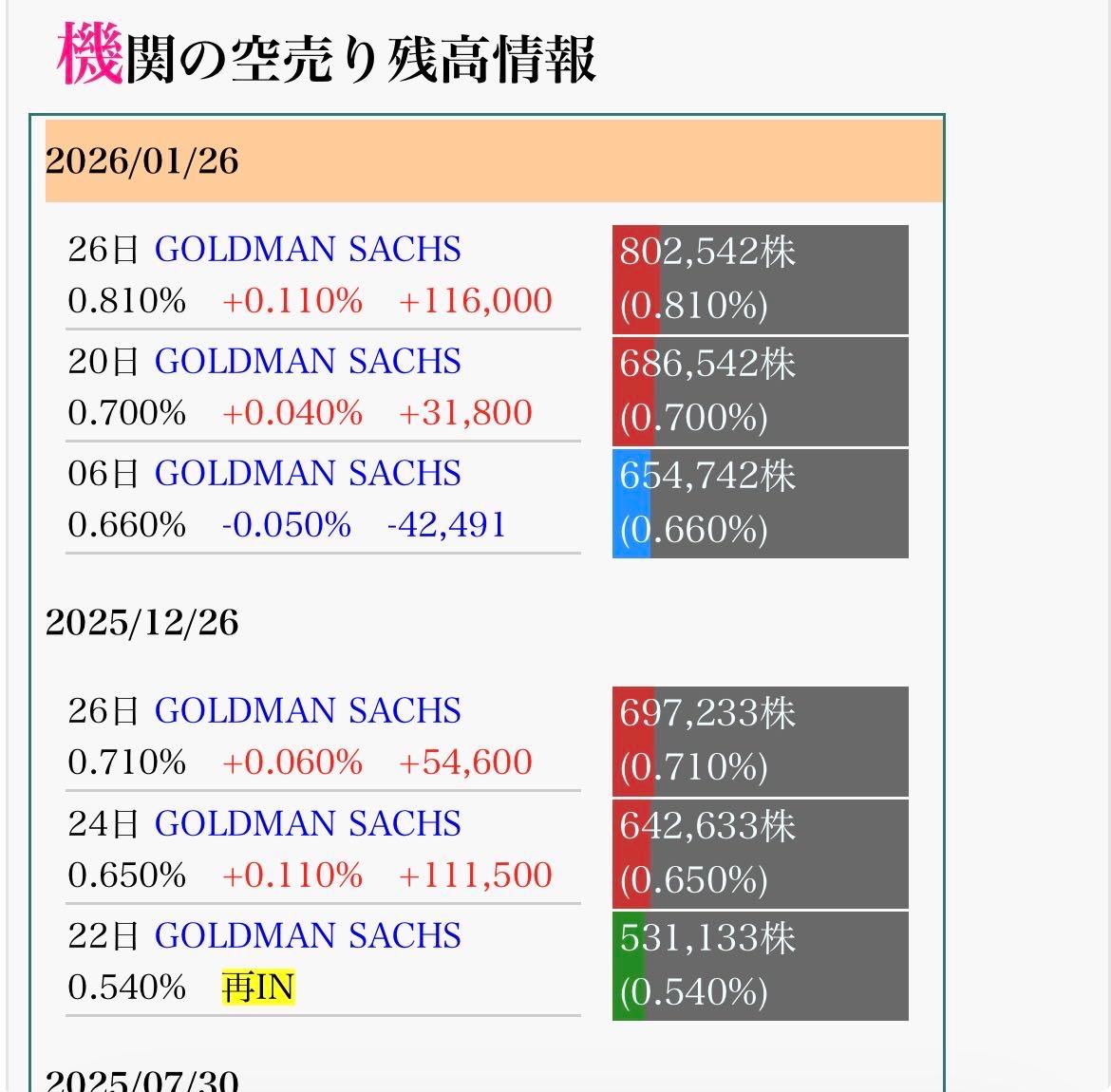 ゴールドマンサックスが1月26日時点で80万株以上の空売りに加えて、個人も空売りしてるのでその合計だとここの出来高考えるとまぁまぁ多いかなと
