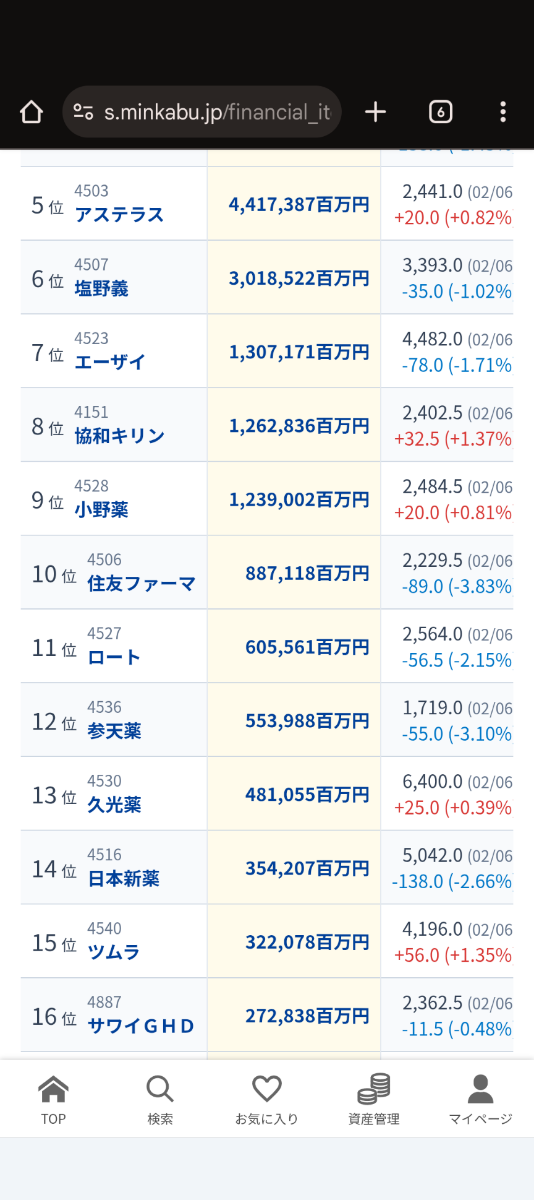 現水準から約4.5倍、株価にして3600円ほどにならないと医薬品時価総額15位にはなれませんので、今後永遠になることはないですね🤪