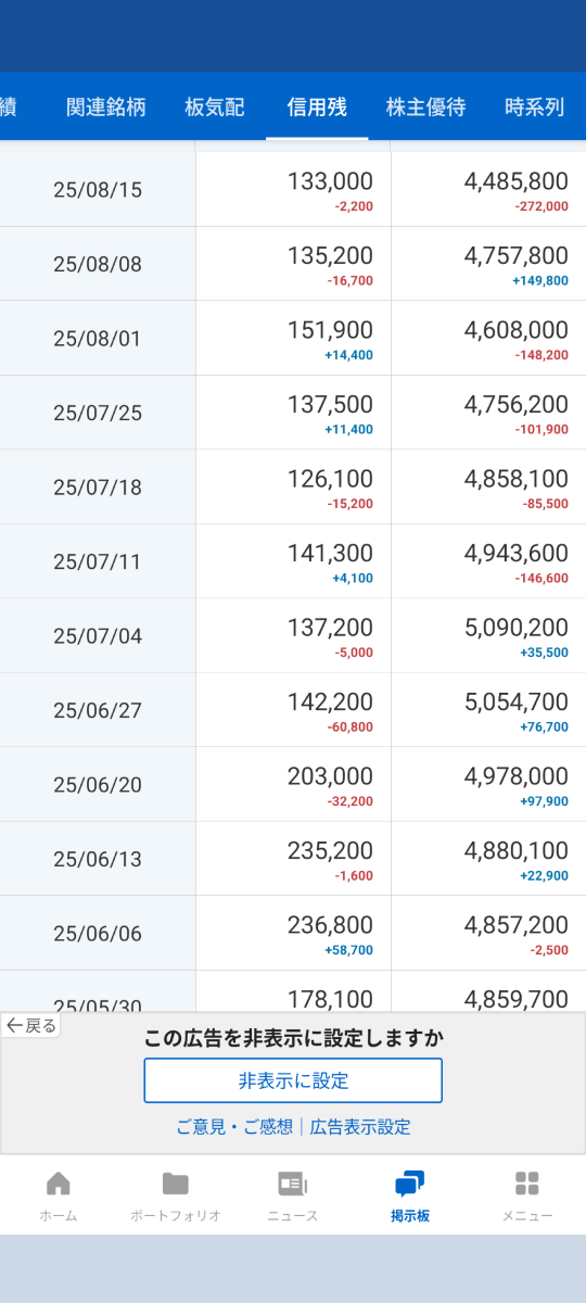 >日証金ベースの8/15現在の信用買い残は27 7万株の大幅減少で、