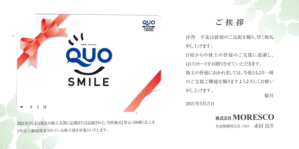【 株主優待 到着 】 (100株 3年以上継続) 1,000円クオカード(SMILE)