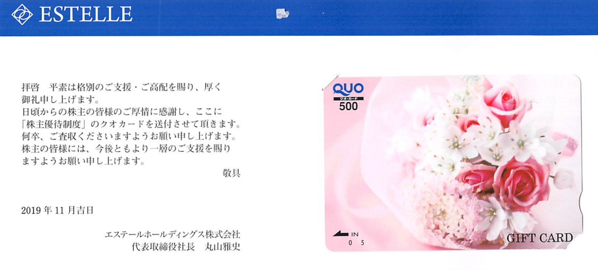 投稿一覧に戻る エステールホールディングス(株)【7872】の掲示板 2015/04/29〜 329 株階段. 2018年11月17日 10:34 >>105 【 株主優待 到着 】 100株 500円クオカード -。 返信する 投資の参考になりましたか? はい3 いいえ51 開く お気に入りユーザーに登録する 無視ユーザーに登録する 違反報告する 証券取引等監視委員会に情報提供する ツイート 投稿一覧に戻る 384 .株階段 2019年11月16日 11:40 >>329 【 株主優待 到着 】 <9月末 100株以上> 500円クオカード -。 返信する 1 投資の参考になりましたか? はい5 いいえ63 開く お気に入りユーザーに登録する 無視ユーザーに登録する 違反報告する 証券取引等監視委員会に情報提供する
