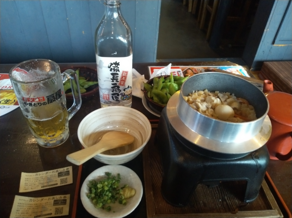 昨日、久々、扇屋に飲みに行ってきたわ。カレンダーお楽しみ券で生中4杯飲んで、他は、鳥釜飯、枝豆食べ放題、焼き鳥もも5本、マカロニサラダ頼み、全部で、2020円くらいやったけど、優待割引券2枚使い、1020円ちょいのお支払い。