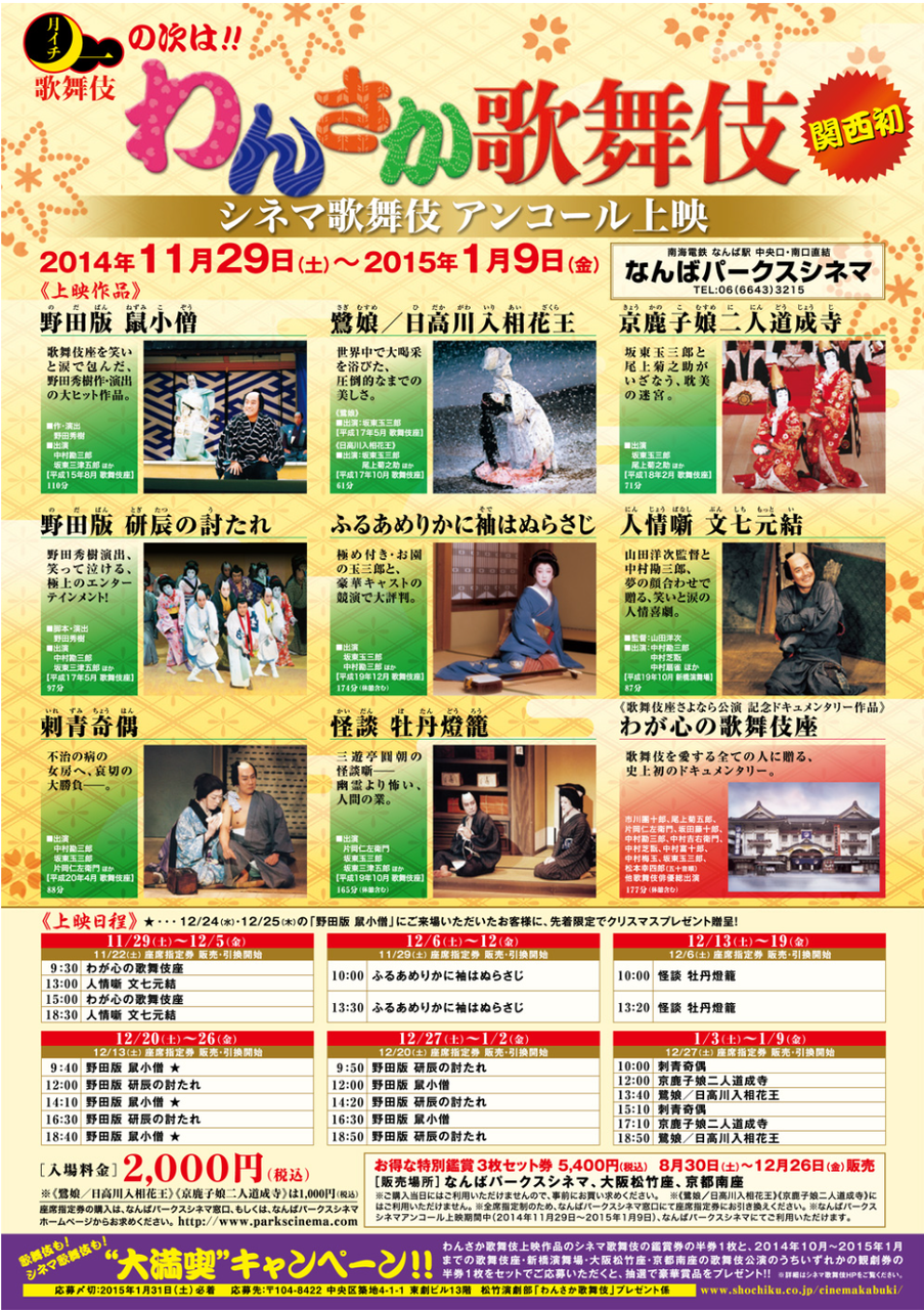 【 10年前(2014年) 11/29- 】 なんばパークスシネマ シネマ歌舞伎全アンコール上映 「わんさか歌舞伎」 ー。