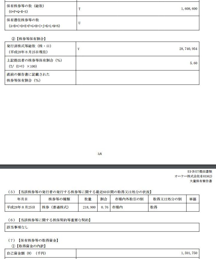 オーケー買い増し 5.60%→8.04%に お見事じゃ(*´ω`*)