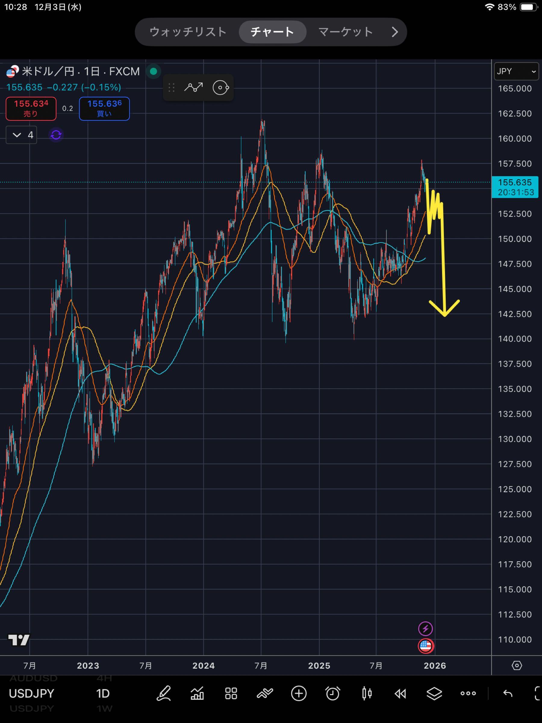11/20を高値に150円台でしばらく揉んでからの下落、同様のイメージでいます。(・–・)ゞ