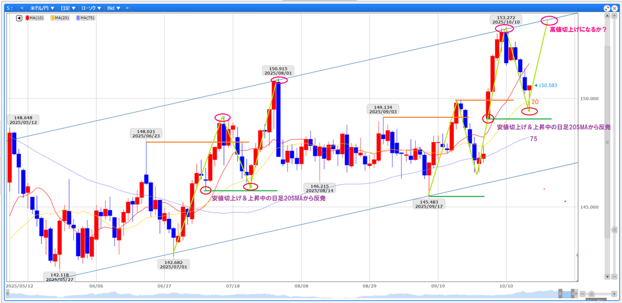 来週、前回の高値を切上げ達成するか手前で落とされるかによっても今後の流れが変わってくるけど、上に更新するようなら次に調整の下げが来ても今回の日足20SMAからの上昇の安値は割れず切上げて151円くらいから反発してくるだろうし。