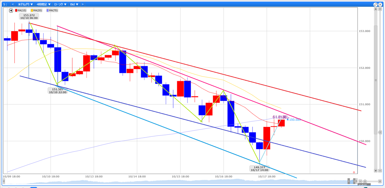クローズ前の戻しでちょうど最後の下降の波に対して61.8%付近まで戻したところ。