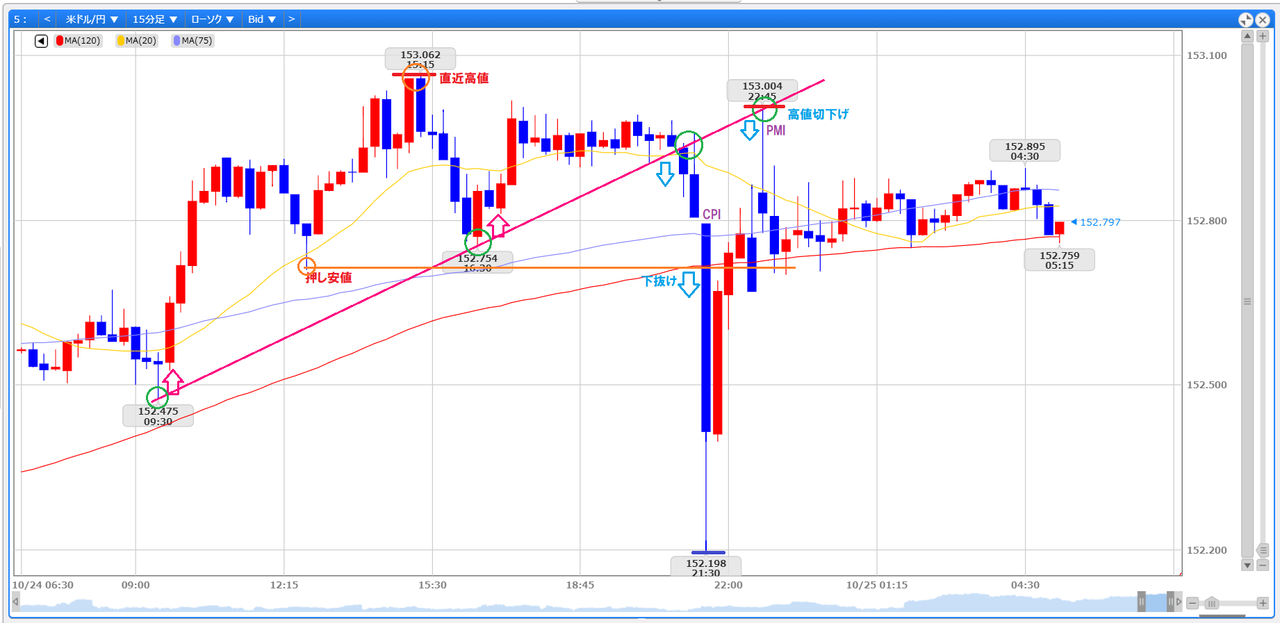15分足はCPI直前の段階で上昇トレンドラインと20SMAを下抜けして、CPIの急落で直近高値を作った押し安値も下抜け確定。