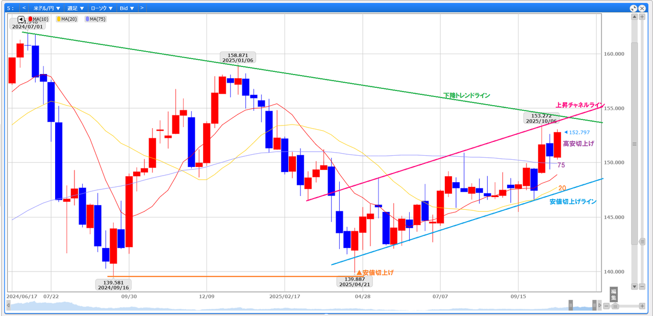 週足の状況見ると151.20にあった戻り高値は実体で上に抜かれて確定しているし、75SMAに対しても上抜けしてから押しを付けて反発しているので150円以下に落とすのはしばらく厳しい状況になったと思う。