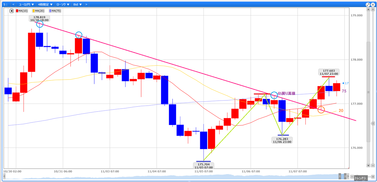 ユーロ円は4時間ミドル上に乗せてきているし、下降ラインも上に抜けてきたのでまた上げてくる感じかな。