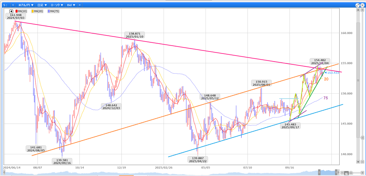 日足ミドルは152.54付近にあって現状ミドル上にいるので上昇中ではあるけど、角度は上向きから横向きになり勢いは弱まっているので下抜けされると大きな下げにつながるので注意が必要。