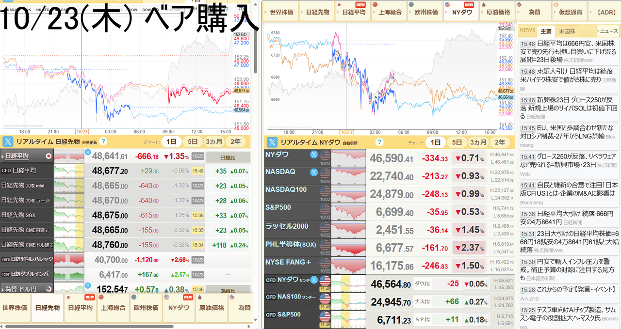 木曜。48,670円-640円(-1.30%)。今日はベアを買った。下げサインが出たので買ったけど、この時間日米共にプラスで嫌な感じだ。まあ引けまではわからないけど、今日から今回引っかかった騙しに引っかからないようなインジケーターを探したのでその精度を確認する。ただしこのままだと複雑になってしまうのでもう少し単純にできないか考える。なにせE=mc^2くらい単純じゃないとなんかこじつけみたいで嘘くさくなる。