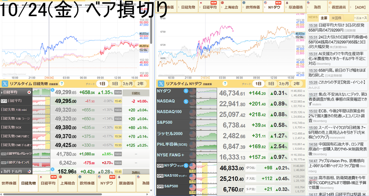 金曜。49,320円+650円(+1.34%)。昨日下がった-640円を綺麗に全戻ししたので、情けない事に昨日買ったベアを損切った。これで7連敗。新記録。自分でも驚くほどの下手糞加減だ。昨日買う時に上向きのトレンドラインまで戻ってきたのと+1σで反発したのが気になったが、他にベアを買う理由を見つけて買ってしまった事がこのザマだ。まあ今回はこの半年で5回(6/18,6/23,7/22,9/3,10/23)しか発生していないRCIの騙しにあったので仕方ないと言えば仕方ないが、RCIの±80の法則と上の2つの理由さえ肝に銘じておけば少なくともベアは買わなかった。という訳で毎度の反省会の材料としてマイルールの見直しをした。見ていると買いたくなってきてその場限りの理由を付けて買ってしまうのであまり相場は見ないようにする。この掲示板も売り買いした時だけ投稿する。今年もあと2か月なので、今日の負けで今年の負け越しもほぼ決まった。これで3年連続負け越しとなり資金もそろそろ底が見えてきた。小遣い増やして子供に贈与税がかからない範囲のお小遣いを上げ続ける夢が夢で終わらないようにもっと死に物狂いトレードをしなくてはいけない。しかし学習能力が低すぎる自分の学習能力を早く高めなければ。