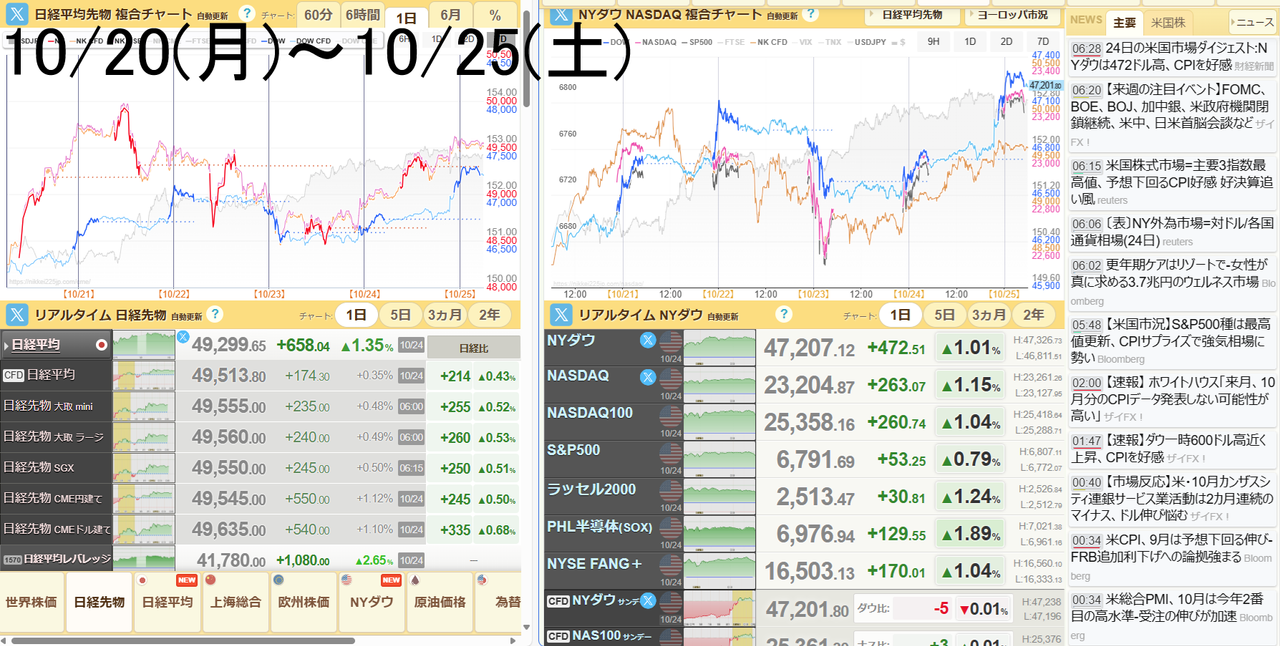 日曜。49,560円+240円+0.49% 6:00。削除されていなかったので昨日入力したはずが保存し忘れたっぽい。CPIが予想より低かった事で追加利下げ期待が高まり、今週予定されている米中首脳会議も好感され、アメリカ3指標ともに史上最高値更新。その流れで日本も上がっている。とりあえず金曜にベアを損切りして良かった事になる。昨日ちょっとだけ見たNOBU塾でフィボナッチリトレースメントの解説をしており非常にわかりやすくて押し目の見極めにはためになりそうなのであとでゆっくり全部を見る。まあこれが絶対という法則なんてないというのはわかっているが、何とかそれっぽいのを見つけてE=mc^2のように単純にトレードが出来ればストレスフリーでありがたい。