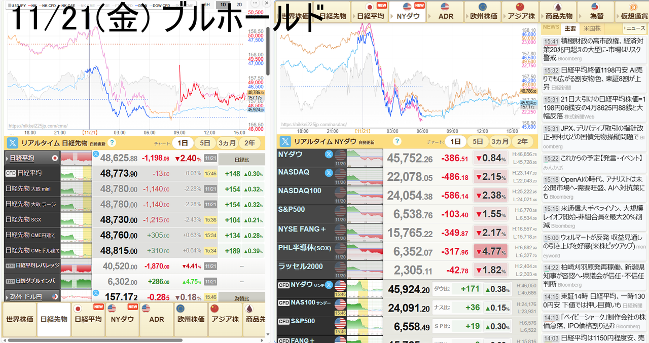 金曜。48,780円-1,140円(-2.28%)。あ~あ、またやっちまった。しかも大幅反落でブルは大損状態。昨日は7連敗で慎重になって1カ月ぶりに自信もってブルを買ったのに8連敗間違いなしの状態。確率を計算したら0.5の8乗なので0.4%というあり得ない位少ない数字。ほんとにどうなっちゃってんだろう。自分でも驚くほどの下手糞さだ。これって全部思ったのと違う方を買えばほぼ100%で勝つという恐ろしい数字だ。昨日買った時に気になった事は、