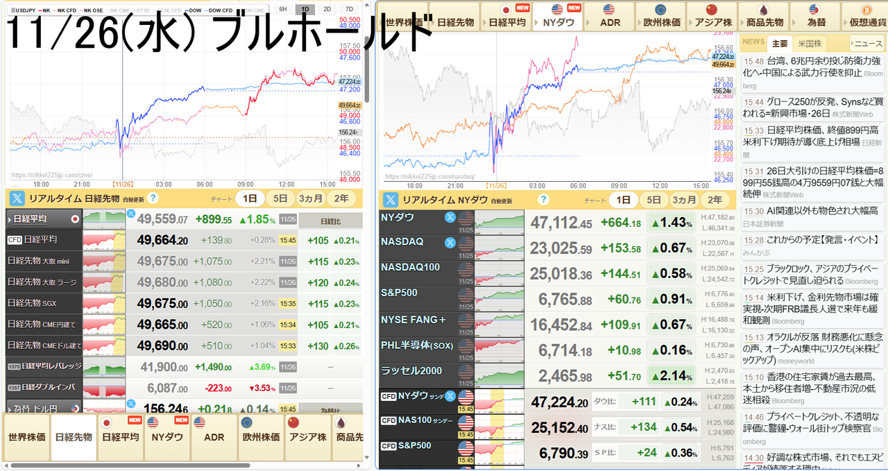 水曜。49,680円+1,080円(+2.22%)。今日もブルをホールドした。上げサインがそのまま継続して更にアメリカにつられて思いの外上がってくれた。ブル買ったのが49,920円でもう少しと思っていたら、今この時間も上がってくれて49,910円+230円+0.46% 01:04という状態。明日感謝祭で休場のアメリカも上がってくれているのでこのまま行くと明日プラ転する。と書くとこの前みたいにダダ下がりの時もあるので何とも言えないけどプラ転したらまさかの状態で損切りしないで済むだけで超々嬉しい。今49,930円になった。まさか休場前のアメリカが4連騰するとは思わなかったが大衆の逆を行くのが大口機関なのでそれもありかもしれない。アメリカはこのままプラスで終わると4連騰、日本はまだ2連騰なので上がり代はまだあるし、上げアサインもその形で表れている。まあ明日の締め切りまでにまた考える。今のままの状態でマイルールだとホールド1択なんだけどビビり―なんで困る。