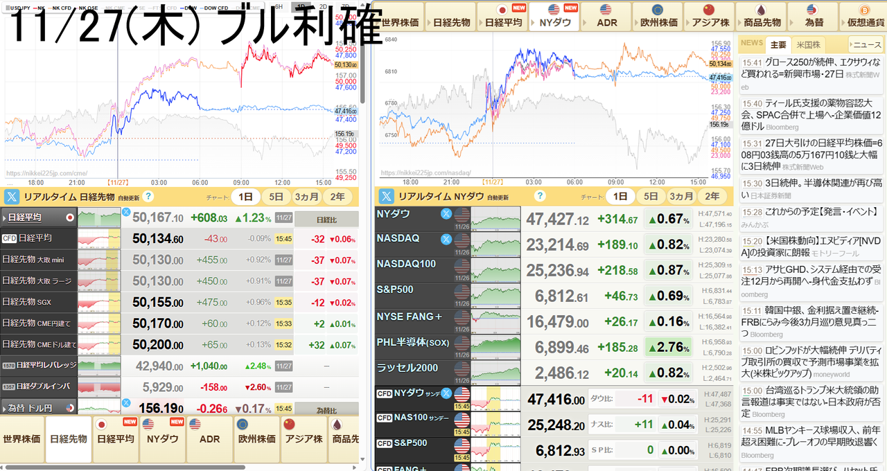 木曜。50,130円+450円(+0.91%)。今日はブルを利確した。何とか8連敗は免れた。サイン的には日本はもう少し上げ余力があるけどアメリカは天井圏になっているので無理せずに利確した。9万の損切り予定が1万の利益で助かった。少ないけど今回はINするタイミングを間違ったので利益が出ただけ運が良かった。それよりなにより連敗が止まった事が嬉しい。ほっとした。今日はアメリカが感謝祭で休場で動かず、日本は-100円レベルなのでほぼ動かず。明日で今月も終わりなので、いよいよ年末だ。早く安定的に勝てるようになりたい物だ。