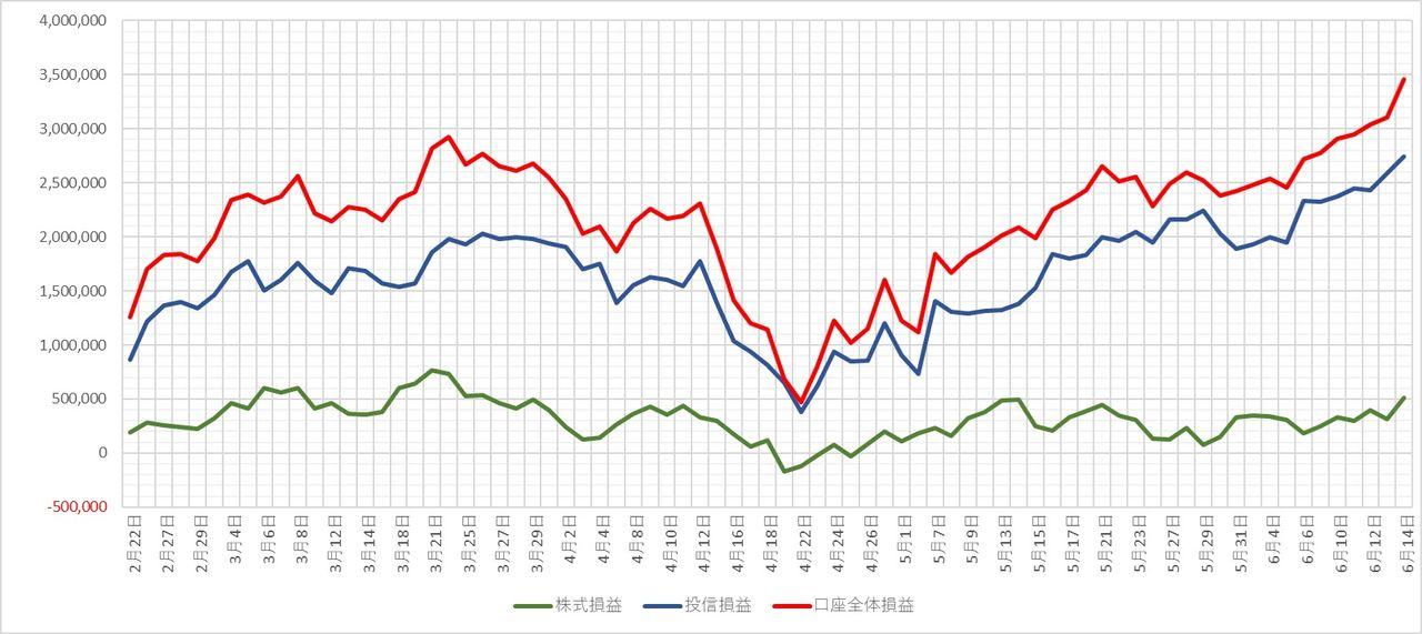 さらに5月末時点と比べた6月の成績は、信用枠が+177k、投信枠が+855kとなり、口座全体では+1,032kと大台超の利益だったよん (^^♪