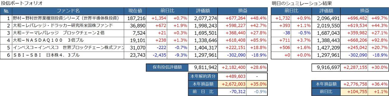 前日比+115k(日本株を除く)と予想し連日での投信枠最高益の更新も確実と思ってた昨夜の投信は、NKが謎の700円超大幅下落に見舞われ、SBI日本株だけで-9.3%、-133kと脚を引っ張り、-70kと沈んでしまった。