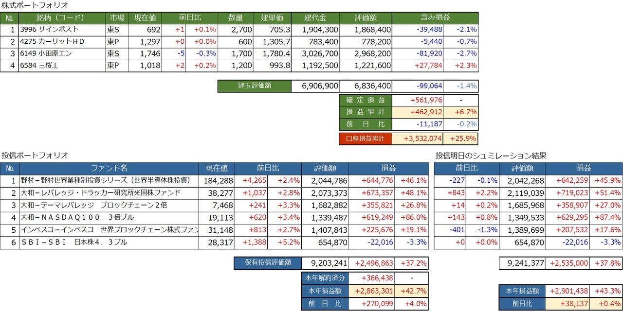 別々に記録してたのをまとめたらどうなるかをお試し中なんだが、口座全体の損益欄を追加してみた。