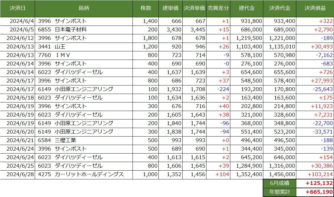 今月はサインとダイハツを中心に持ち高調整(下げたらナンピン、値を戻したところで高値建て玉とナンピン玉を合算し±0前後で相殺売り)に終始してたが、最後にきてカーリットを+103kで利確できた。