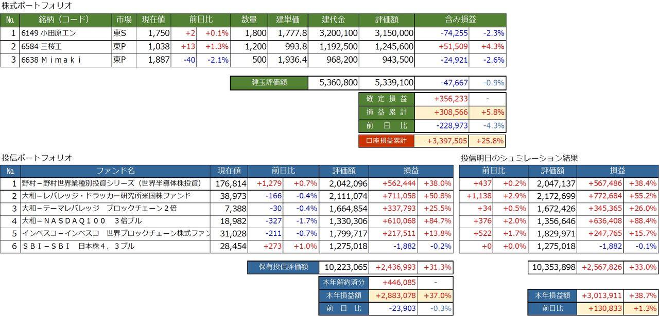 日本株を除く明日の投信PFは+130kで今年の最高益に再度迫ると予想。
