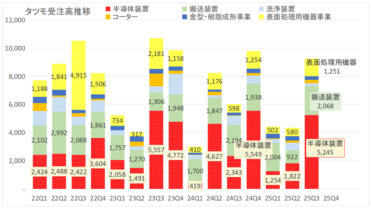 私は "AI半導体" 関連銘柄として "超割安" に放置されている タツモは 常にウォッチしてきましたが 第2四半期までは 受注高が低迷していたので "割安放置" も仕方ないと思っていました。しかし 本日発表された第3四半期決算で かなり高水準の受注高を計上していました。機関投資家に適正株価を水準訂正される日も遠くない…と考えています。