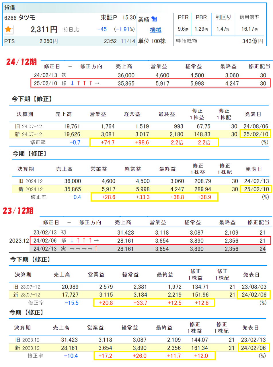 下図のとおり タツモは前24/12期と前々23/12期と2年連続で 下期見通しおよび 通期業績を相当程度 上方修正しています。