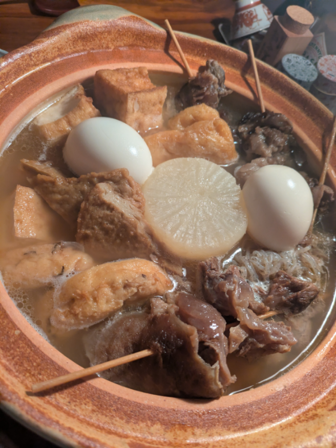 夜は昨晩用意しておいた関西風おでんを土鍋で温め直し。