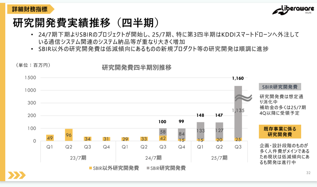 リベラウェアの決算説明資料の研究開発費 推移において "SBIR"(=Small Business Innovation Research:スタートアップ等による研究開発を促進し その成果を円滑に社会実装し それによって我が国のイノベーション創出を促進するための国の制度)受託分とそれ以外の自社固有の "既存事業分" とに分けて表示してくれているところが非常に好感できます。
