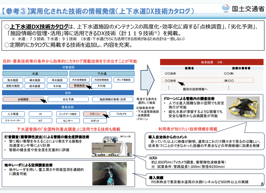 下記の国土交通省の資料で数カ所に掲載されています。特にこのページはリベラウェアのドローンが下水道点検の標準機材になるであろうことを推測させてくれます。