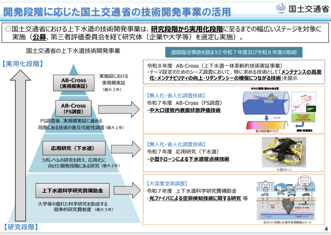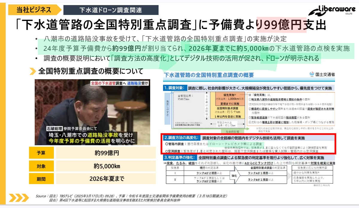 ・24年度予算予備費から約99億円が割り当てられ、2026年夏までに約5,000㎞の下水道管路の点検を実施