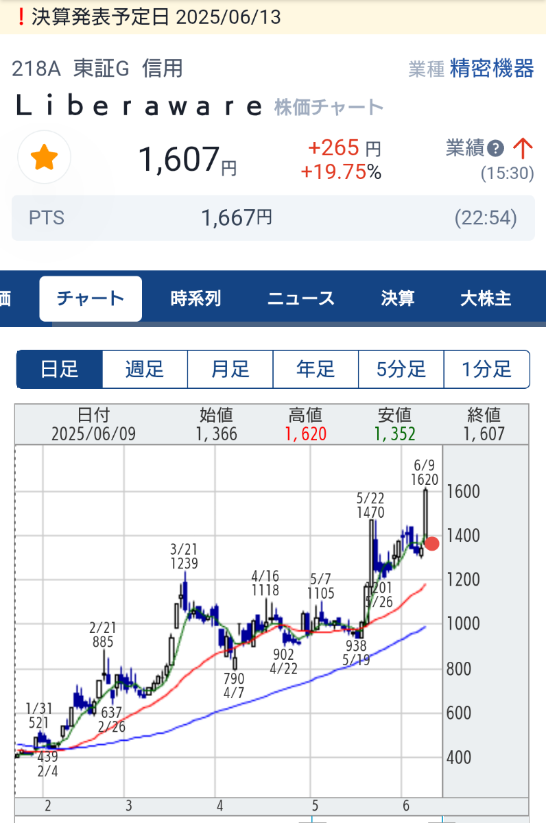 今日は↑Liberawareが "ドローン相場" の波に乗り 連日の大幅高でした。