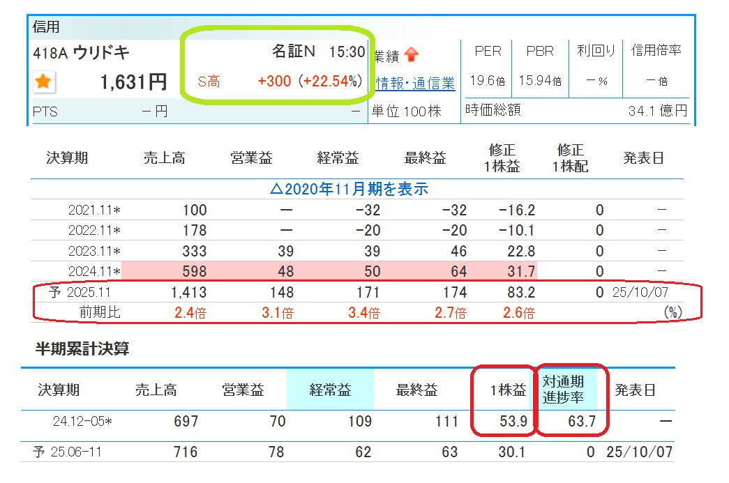 418A ウリドキ 1,631円 S高 +300円 +22.54%