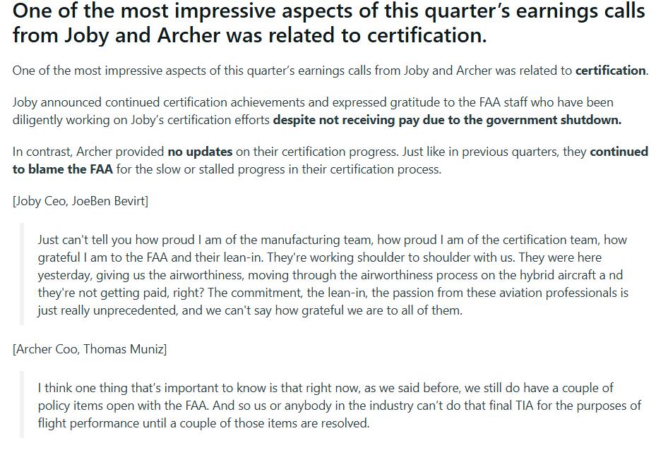 今四半期のJobyとArcherの決算発表で最も印象的だった点のひとつは、認証に関する内容でした。