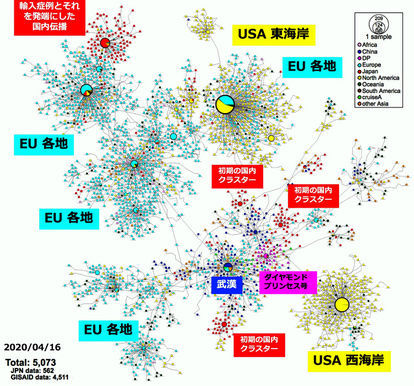 【写真】新型コロナウイルスの全遺伝情報の関係を表した図。国内クラスターやクルーズ船で検出されたウイルスは「武漢」(中央下)に近い場所にある。3月以降に感染が広がった「輸入症例とそれを発端にした国内伝播(でんぱ)」は「EU各地」(左上)と近い場所にある(国立感染症研究所提供)