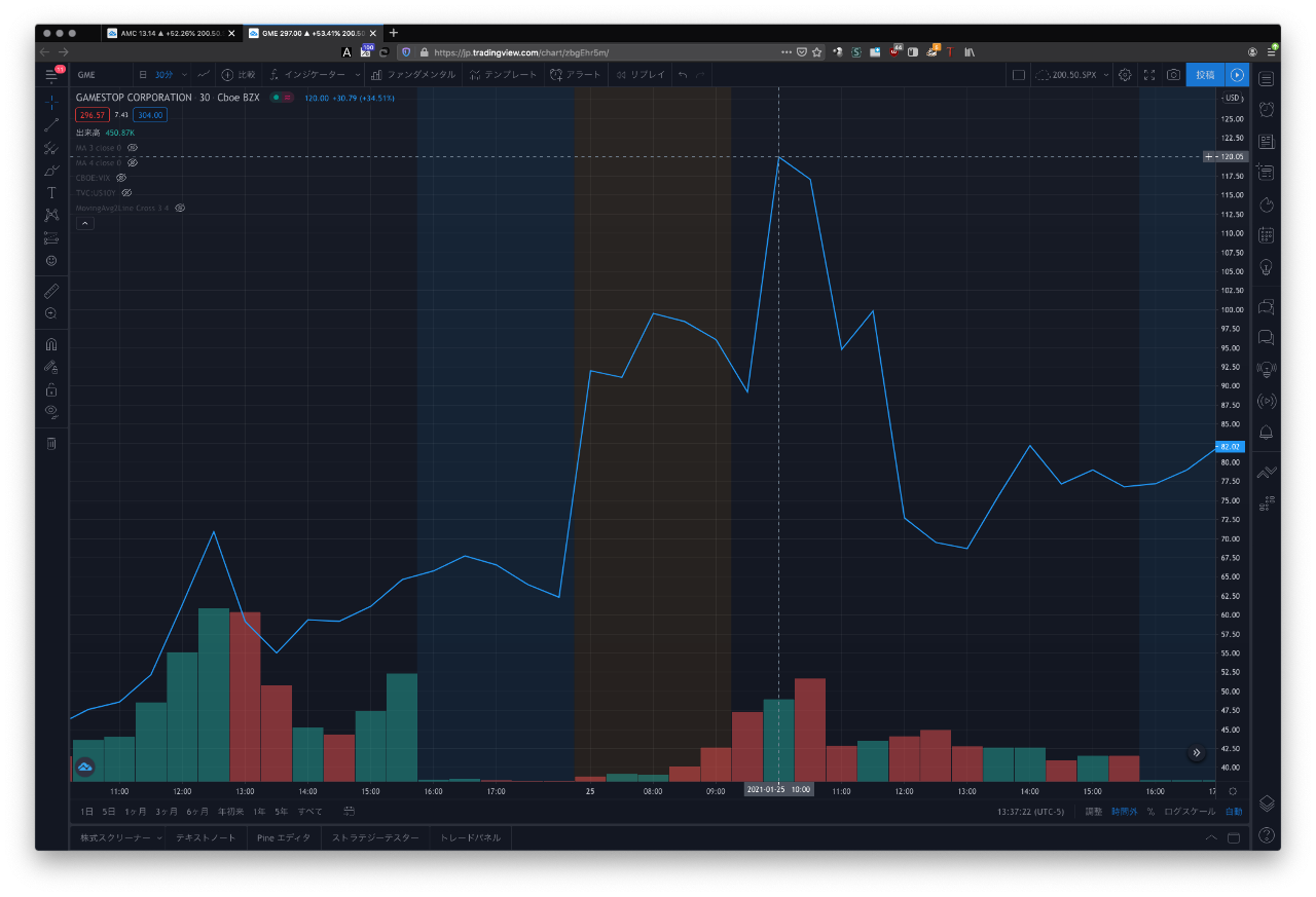 1/25のゲームストップのチャートを見ると画像のように一気に上がっている。