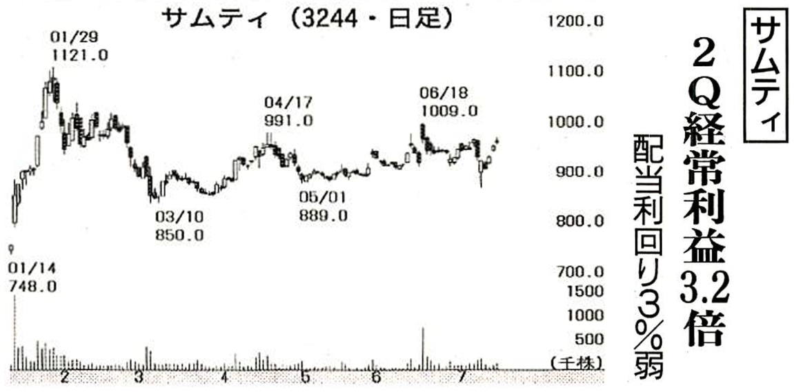 株階段.![サムティホールディングス(株)【187A】 【 10年前(2015年) 】 サムティ [3244] (2015年) ファンド向け新築、再生マンション販売を全国展開。個人向け投資マンションも。賃貸案件多彩 「・・・【大幅増配】柱のマンション販売は粗利いい再生大型や新規REIT向けが寄与。賃貸も資産積み上げ、大型テナントの解約違約金計上で膨れる。営業利益増額。賃貸資産入れ替えで売却特益。増配拡大。16年11月期は自社開発マンションで営業利益下支え。 【開 発】6月30日上場の新規REIT(当社がスポンサー)向けに自社開発マンション供給。竣工は16年度8棟(15年度2棟)。](https://textream-cimg.west.edge.storage-yahoo.jp/ca/97/23/9806560735d035593f03e741266ca09a1765206869.png)