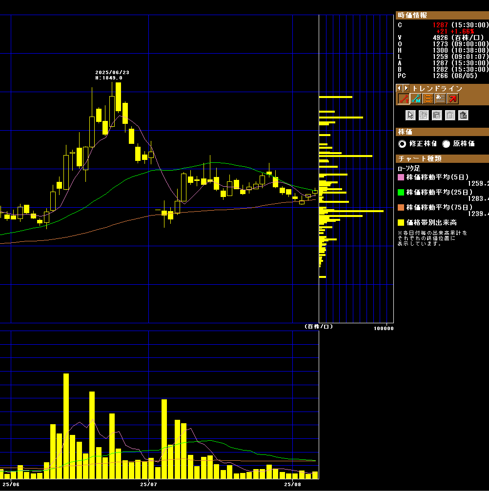 価格帯別出来高を見ると、6月に1400円以上で買わされた奴も多いだろうから、そこで買わされた信用勢なんかは追証で自動的に投げさせられるわけだからね