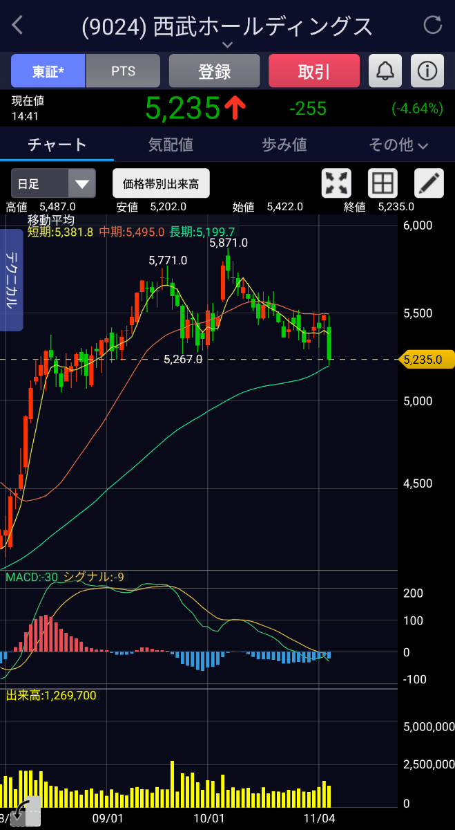 75日線にタッチ。酷い動きだな。