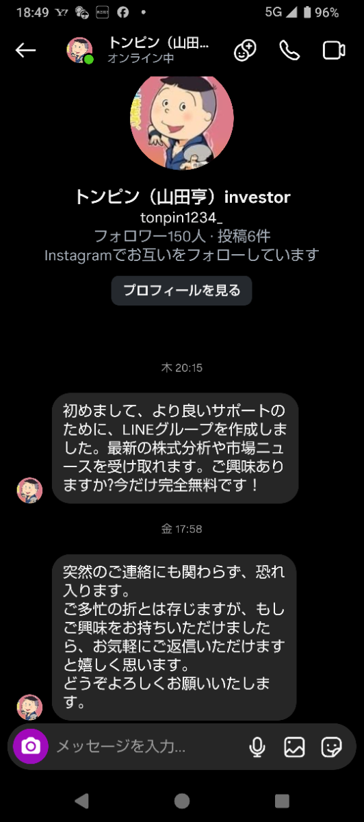 天下のトンピンさんが俺のインスタにメッセージしてくれるなんてあり得ないので、詐欺師だとは思いますが…