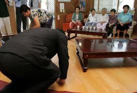 自称元慰安婦のいるナヌムの家を訪問し、彼女たちの罵詈雑言を浴びながら、40分にわたって土下座。 ↓ ↓